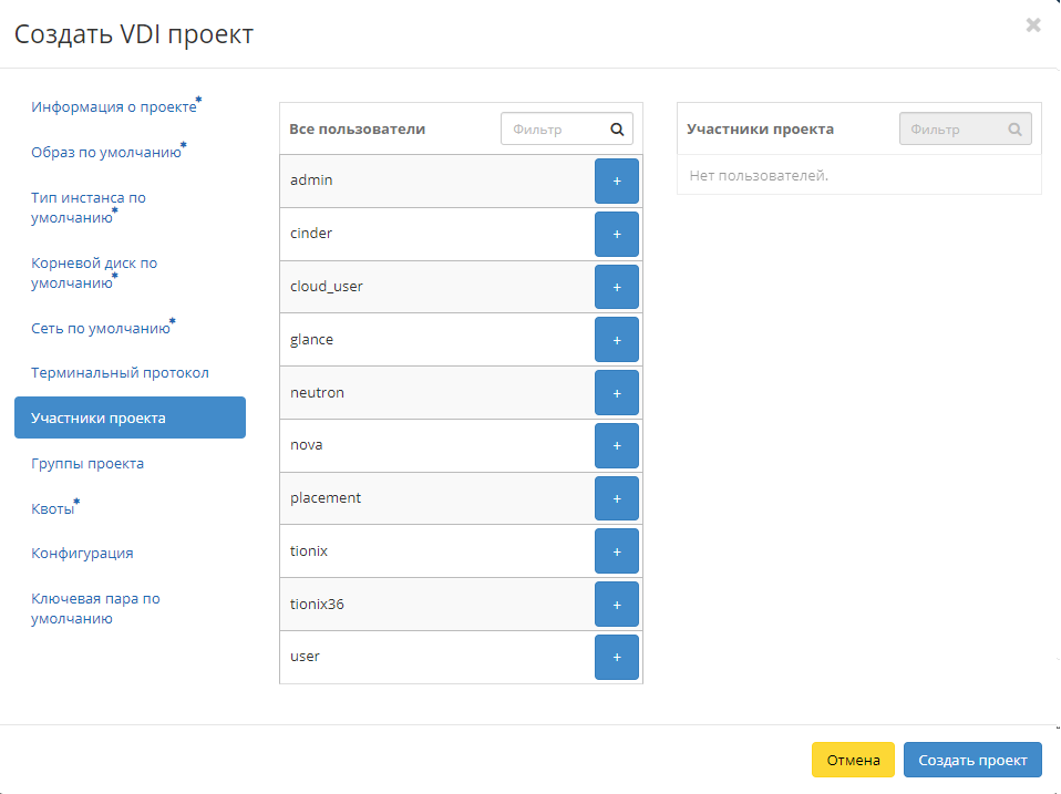 - Все пользователи - перечень всех доступных пользователей VDI проекта;