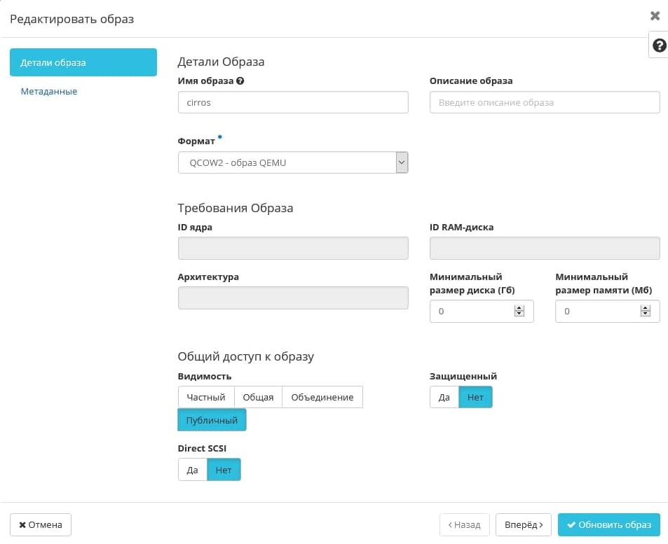 | Видимость | Показывает, публичен ли образ или снимок. Публичные доступны всем, непубличные - только в рамках проекта, в котором созданы. |