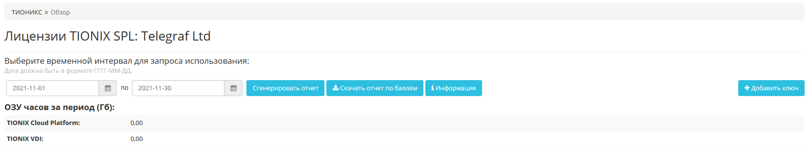 Отображает перечень установленных модулей, их статус и период действия лицензий. Также при наличии установленного модуля TIONIX.PointMeter на странице будет доступна информация по объему потребленных вычислительных ресурсов (ОЗУ) облака за отчётный период: