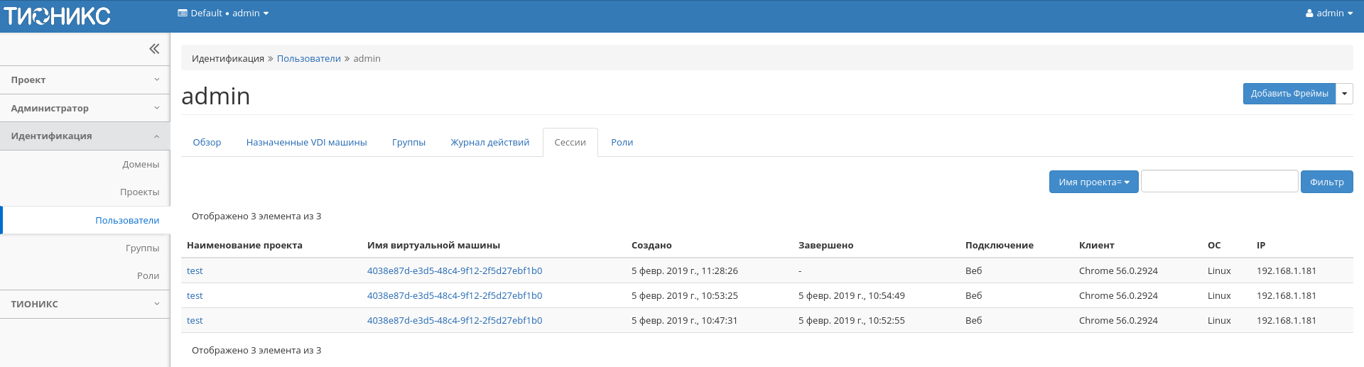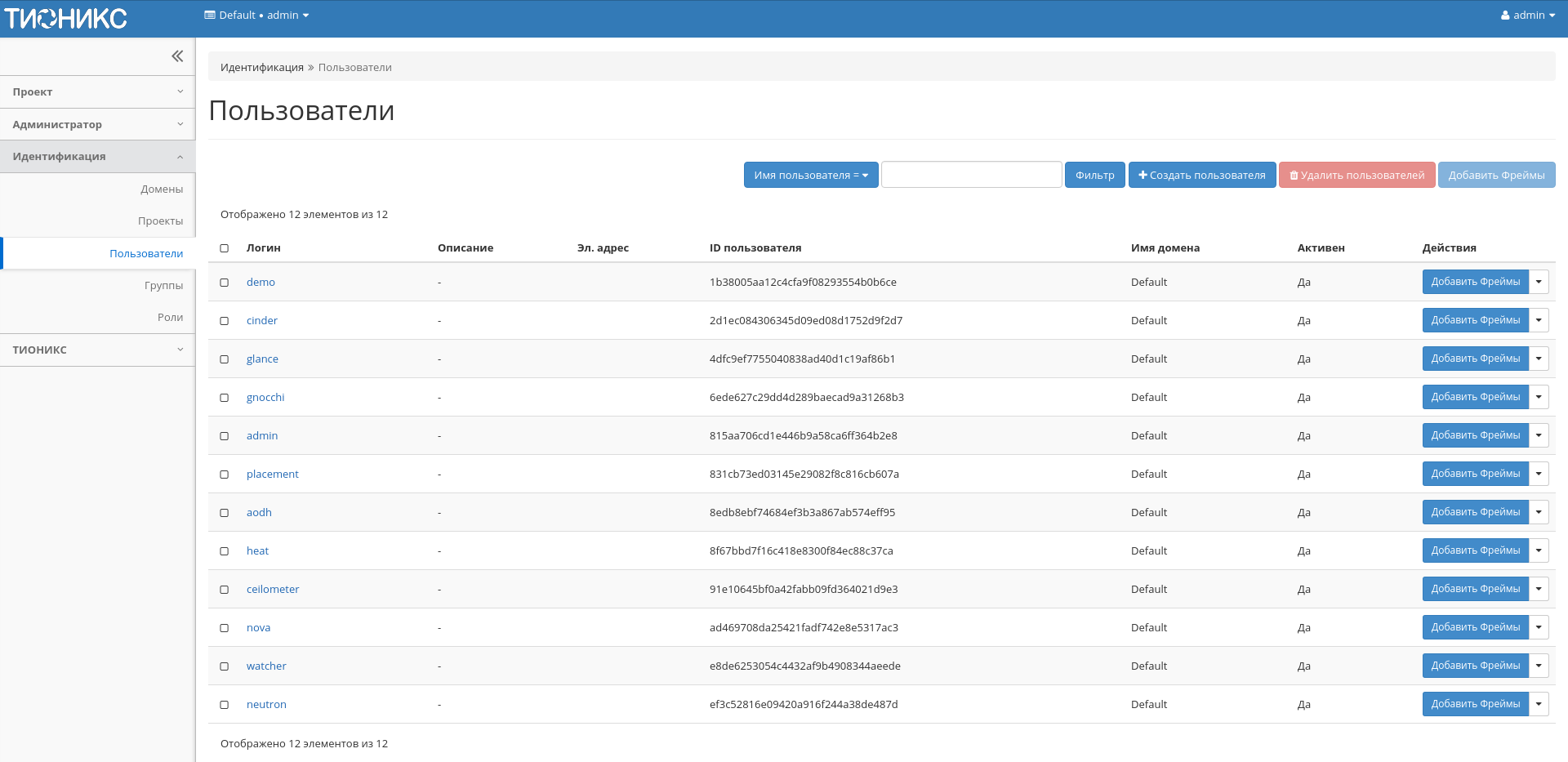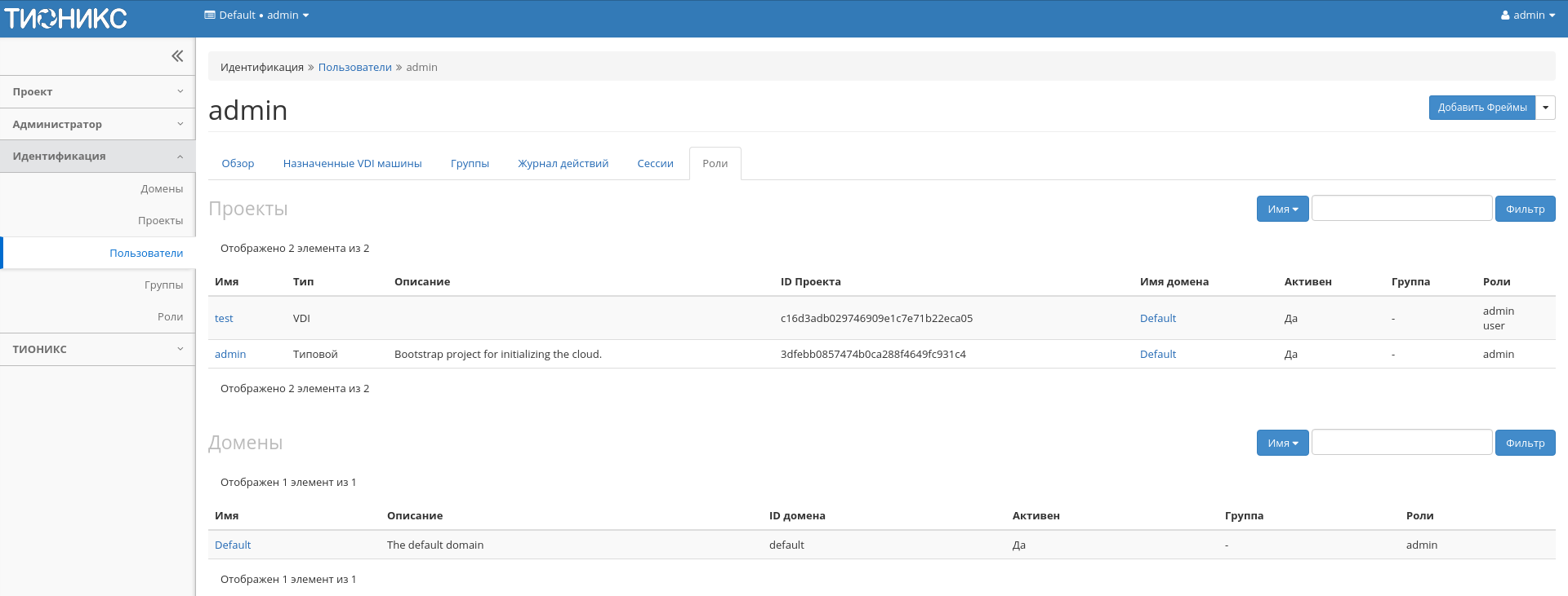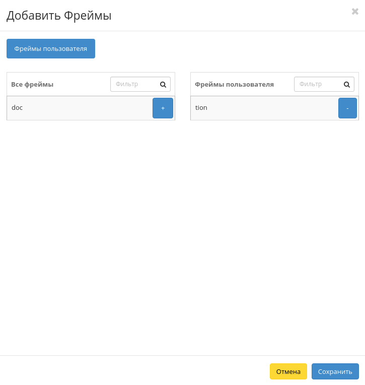 | 2 | Добавить фреймы | Управление фреймами пользователя. Действие доступно только для пользователя с правами администратора домена. |