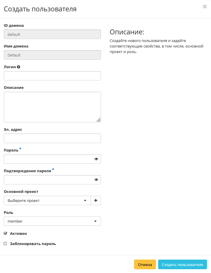 - Флаг «Активен» - состояние пользователя после создания;