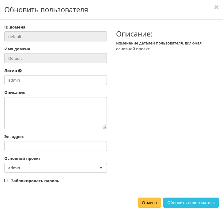 В открывшемся окне выбираем необходимые параметры. Завершаем процедуру кнопкой «Обновить пользователя».