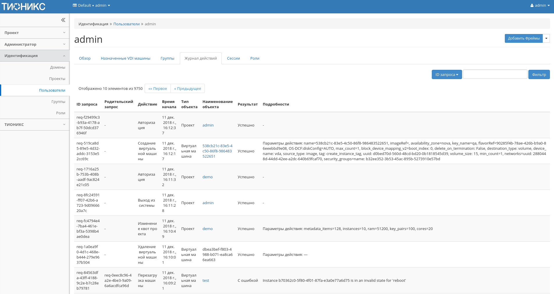 | Родительский запрос | Идентификатор запроса, который является родительским по отношению к данному, например, если действие произведено по запросу из VDI клиента или планировщика. Если действие выполняется по запросу из Dashboard, то родительский запрос отсутствует. |