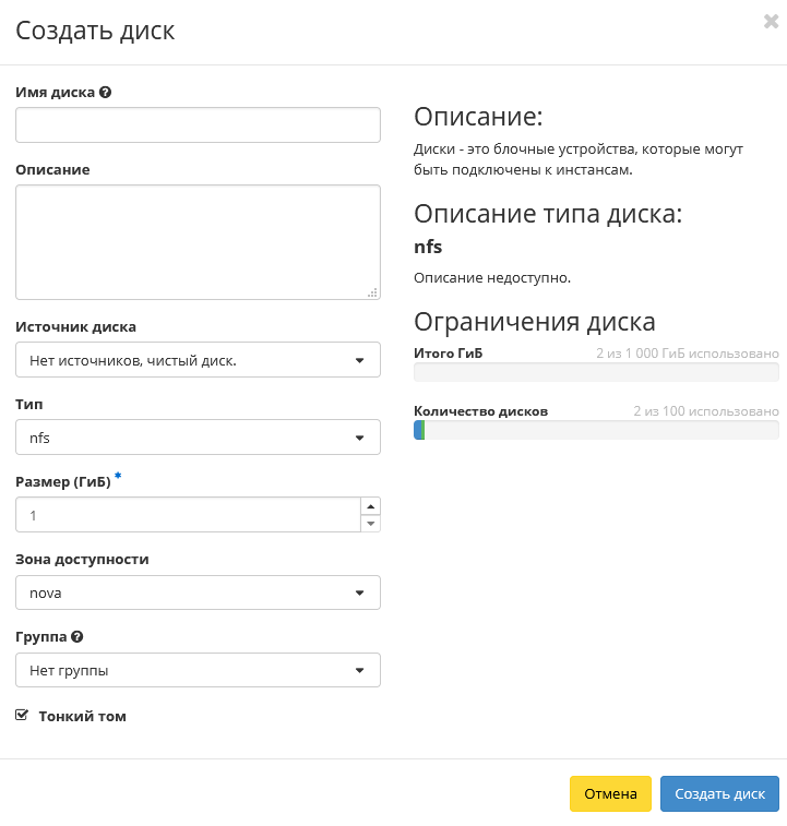 - Флаг «Тонкий том» - при выборе флага задействуется технология «Thin provisioning», которая позволяет использовать свободное пространство диска для других нужд проекта.