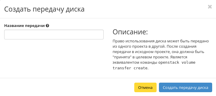 Диск можно переносить из одного проекта в другой. Функция доступна в общем списке всех дисков. После вызова действия Вам будет предложено задать название передачи диска, поле не обязательно к заполнению и при пустом значении сгенерируется автоматически.