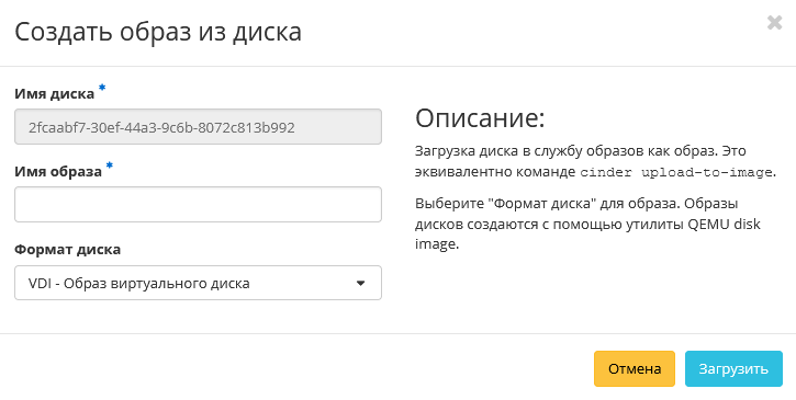Функция позволяет загрузить диск в службу образов как образ. Доступно как в общем списке, так и во вкладках с детальной информацией. После вызова действия в открывшемся окне задаем имя и формат образа.