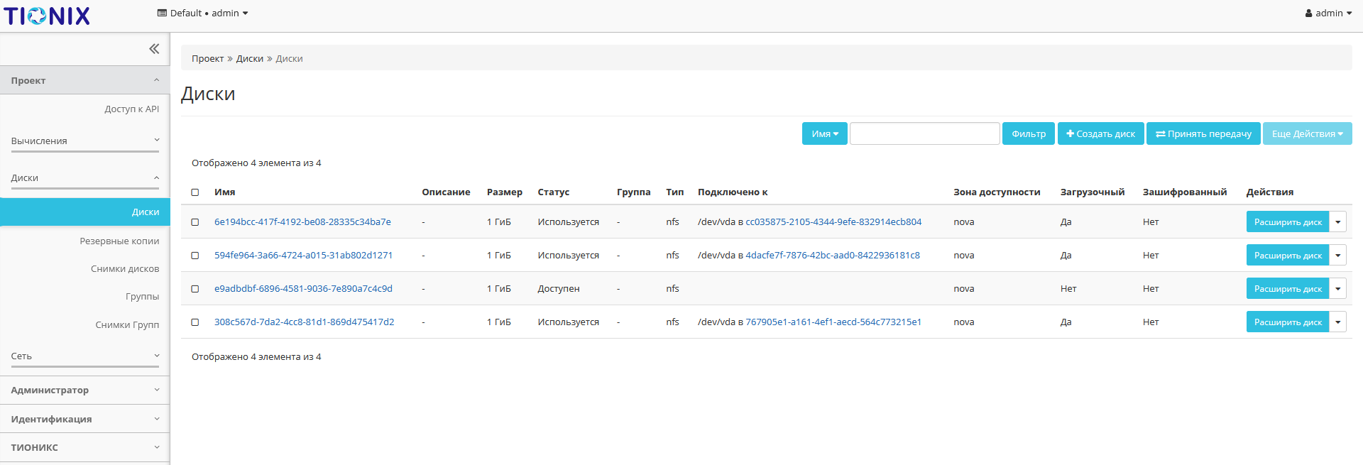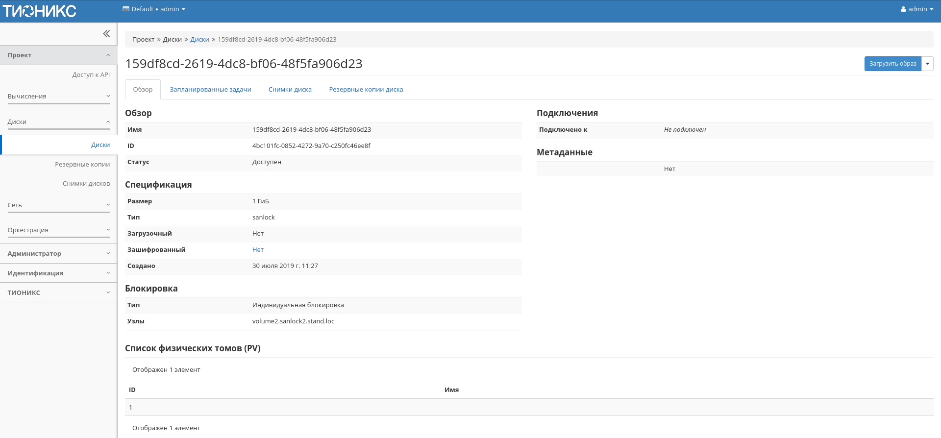| Имя | Имя диска, присваивается пользователем при создании. Также изменяется в общем списке и является ссылкой для перехода к детальной информации о конкретном диске. |