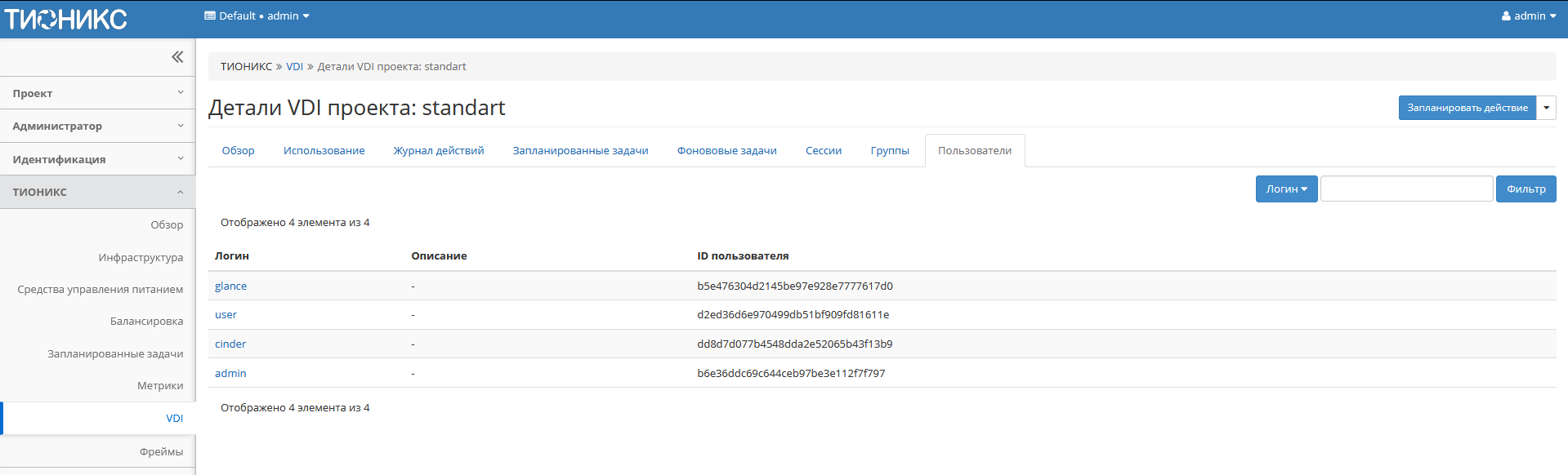 • Все пользователи - перечень всех доступных пользователей VDI проекта;