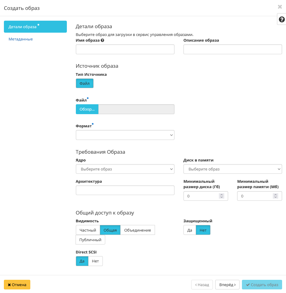 | Видимость | Показывает, публичен ли образ или снимок. Публичные доступны всем, непубличные - только в рамках проекта, в котором созданы. |