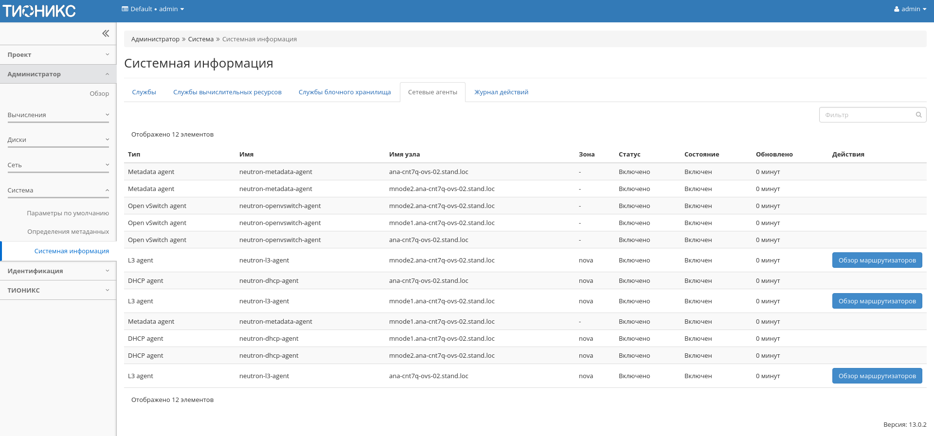 Позволяет отслеживать: состояние служб, состояние сетевых агентов и значимые действия в системе. Состоит из следующих внутренних вкладок: