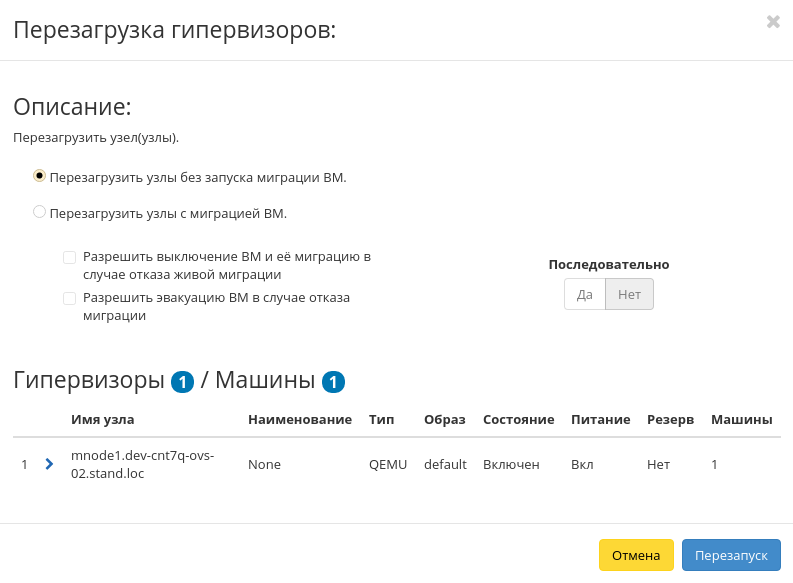 Функция доступна в общем списке всех вычислительных узлов. Позволяет производить миграцию всех виртуальных машин с отключенного узла. После вызова действия в открывшемся окне выбираем тип миграции и указываем дополнительные параметры: