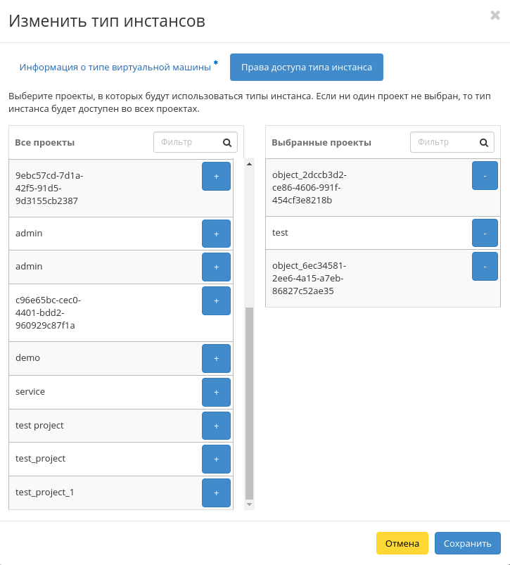 • Права доступа - выбор проекта, в котором будут использоваться типы инстанса. Если ни один проект не выбран, то тип инстанса будет доступен во всех проектах.