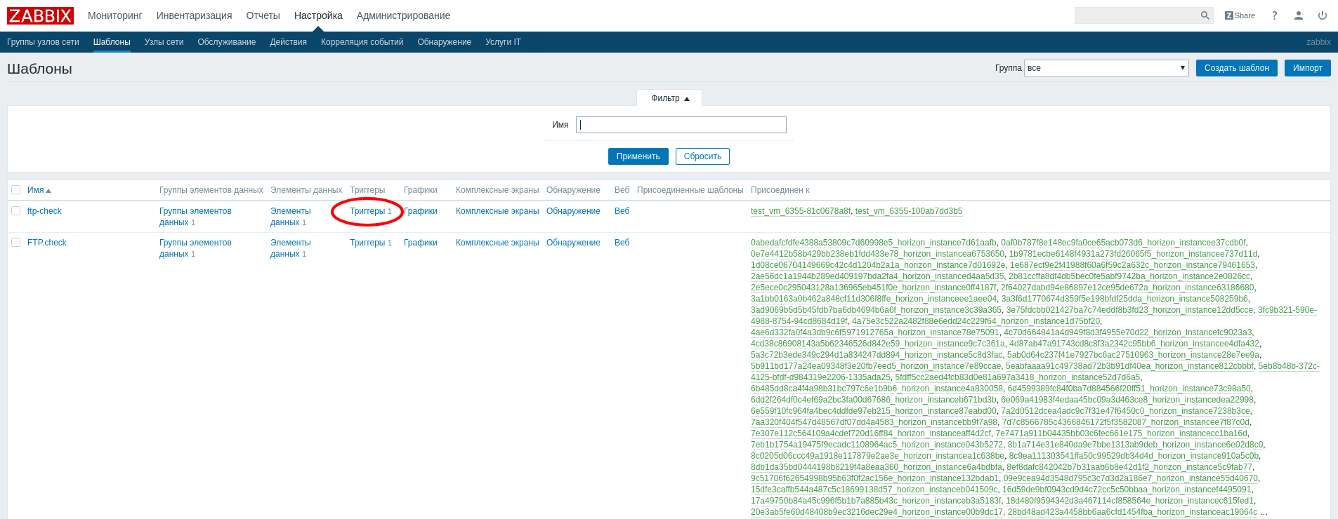 1. Перейдите в «Настройка»/«Шаблоны», найдите в списке шаблон ftp-check и нажмите на «Триггеры»: