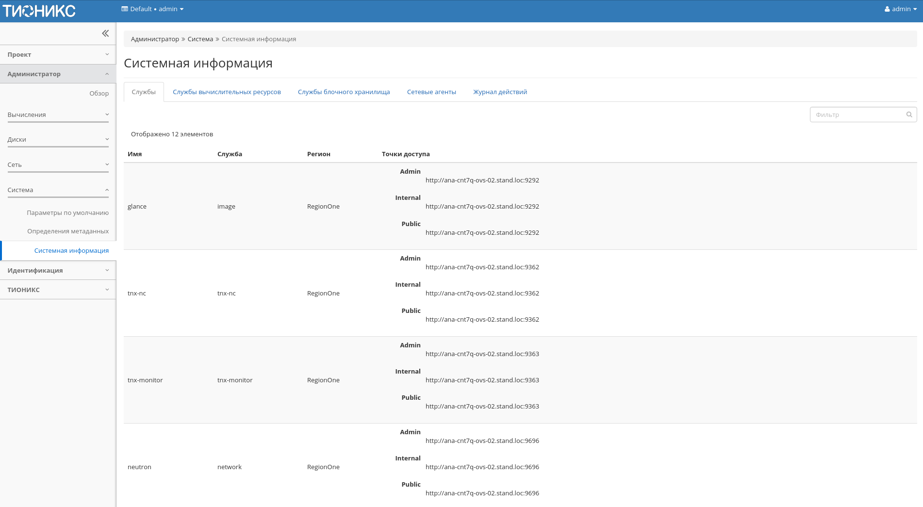 Позволяет отслеживать: состояние служб, состояние сетевых агентов и значимые действия в системе. Состоит из следующих внутренних вкладок:
