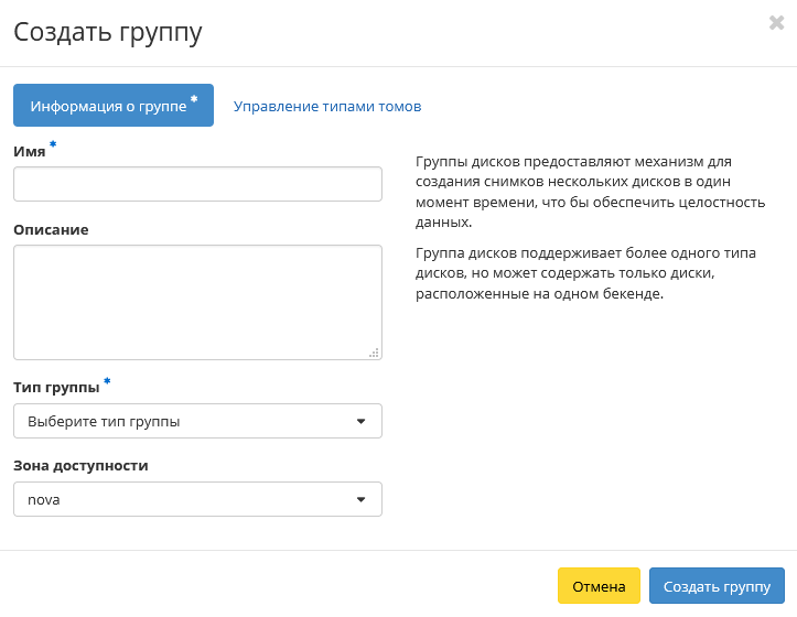 | Тип дисков | Тип группы дисков, задается при создании. |