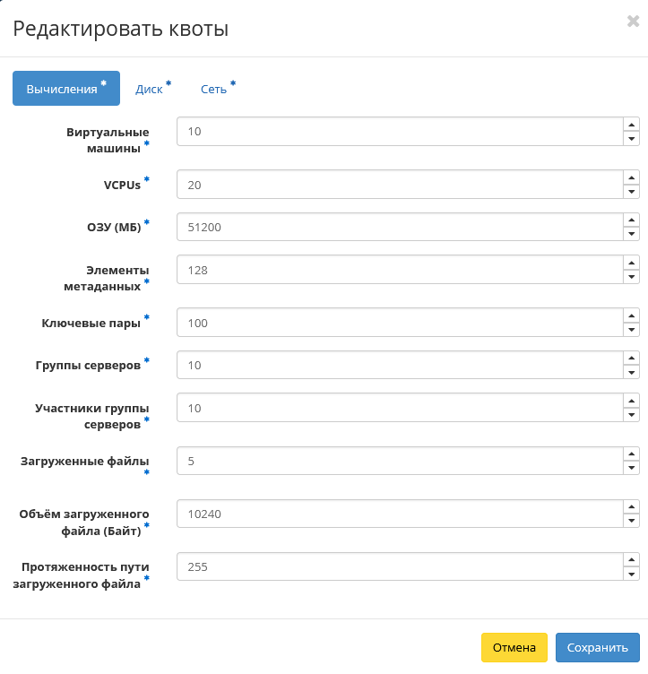 - Квоты - параметры по умолчанию для проекта, подробное редактирование параметров доступно на странице.